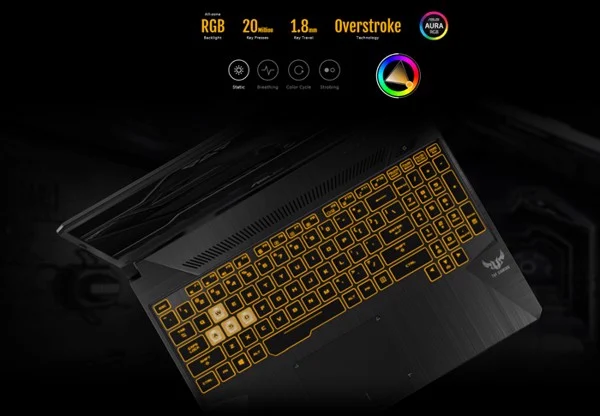 Sở hữu hành trình phím 1.8 mm với 20 triệu lần nhấn, đủ cho nhiều năm làm việc và chơi game. Bàn phím có tính năng RGB-backlighting và được điều khiển thông qua TUF Aura Core để bạn có thể thể hiện phong cách độc đáo của riêng mình.