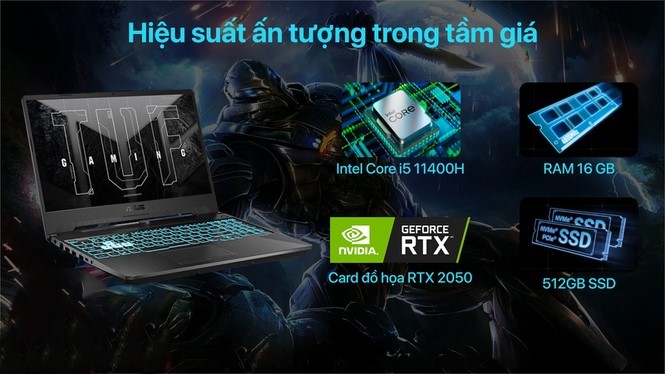 ASUS TUF Dash F15 2023 trang bị bộ vi xử lý Intel Core i5 11400H thuộc thế hệ thứ 11 Tiger Lake. Con chip này có sức mạnh cực khủng khi sở hữu tới 6 lõi 12 luồng, tốc độ tối đa lên đến 4.50GHz, TDP 45W. Cả hiệu năng đơn nhân và đa nhân đều xuất sắc khiến cho TUF Gaming FX506 không chỉ chơi tốt mọi tựa game hiện nay mà còn làm việc vô cùng hiệu quả khi chạy được cả những phần mềm chuyên nghiệp. Hơn nữa, ASUS TUF Gaming F15 FX506HF HN017W còn có sẵn 16GB RAM, nâng cao hiệu suất và tăng khả năng tương thích game. Ngoài ra, ổ cứng SSD NVMe PCIe dung lượng cao 512GB giúp bạn tải game và mở ứng dụng hết sức nhanh chóng, không cần phải chờ đợi.
