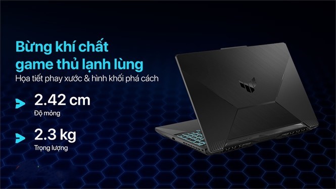 Khí chất game thủ được toát lên ngay khi bạn nhìn vào ASUS TUF Dash Gaming F15 FX506. Phiên bản màu Đen Graphite Black cực ngầu với màu sắc chủ đạo là đen tuyền cổ điển nhưng không hề nhàm chán nhờ họa tiết phay xước cùng những hình khối phá cách. Chất lượng hoàn thiện cao và cách bố trí họa tiết thông minh giúp ASUS TUF Gaming có vẻ đẹp riêng biệt khi đặt cạnh các đối thủ. Đồng thời máy cũng rất di động với kích thước tổng thể gọn gàng và trọng lượng chỉ 2,3kg.