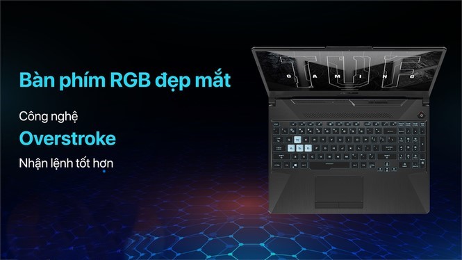 ASUS TUF Gaming F15 FX506HF HN017W sở hữu bàn phím chiclet với đèn nền RGB tuyệt đẹp, tối ưu cho chơi game. Công nghệ Overstroke giúp khả năng nhận lệnh của bàn phím tốt hơn, cho tốc độ phản hồi nhanh hơn. Bạn có thể thao tác chính xác, dành lợi thế trong từng trận game. Đèn nền RGB cùng hệ thống đồng bộ ASUS AURA RGB mang đến niềm cảm hứng chơi game bất tận, đẹp và phong cách.