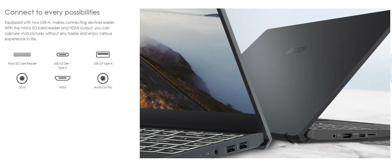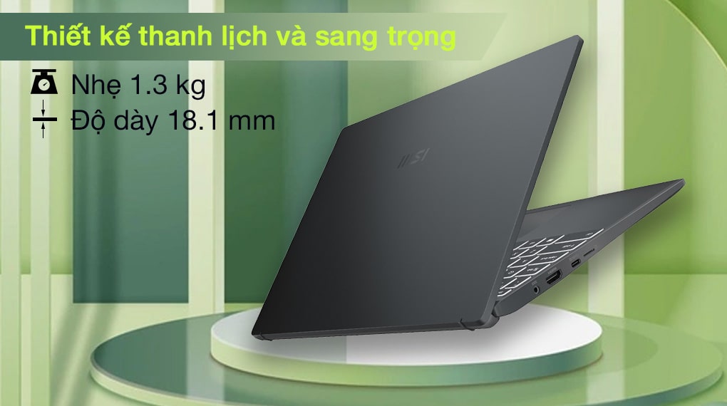 Nhắc đến ngoại hình của laptop MSI Modern 14 B5M 204VN, ta không thể nào không nhắc tới sự mỏng nhẹ của dòng laptop này. Với kích thước 319 x 220.2 x 16.9-18.1 mm và cân nặng chỉ 1.3kg bạn hoàn toàn có thể để vào túi xách, balo, túi tote, sẵn sàng mang theo mọi nơi để phục vụ cho công việc của bạn.