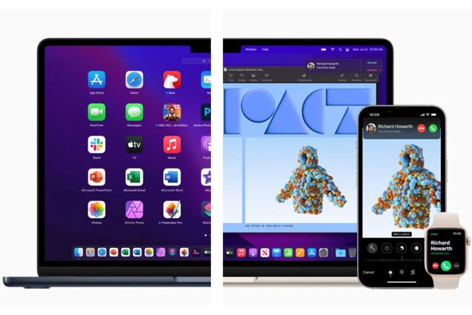 Độ tương thích và khả năng tối ưu phần cứng tuyệt vời của macOS giúp MacBook Air M2 2022 phản hồi nhanh chóng mọi tác vụ bạn mong muốn – bao gồm các phần mềm văn phòng Microsoft 365. Sự linh hoạt của hệ sinh thái Apple giúp bạn dễ dàng nhận cuộc gọi iPhone ngay trên máy Macbook, sử dụng iPad như một màn hình phụ và đăng nhập vào MacBook Air M2 thông qua Apple Watch một cách linh hoạt, mượt mà.