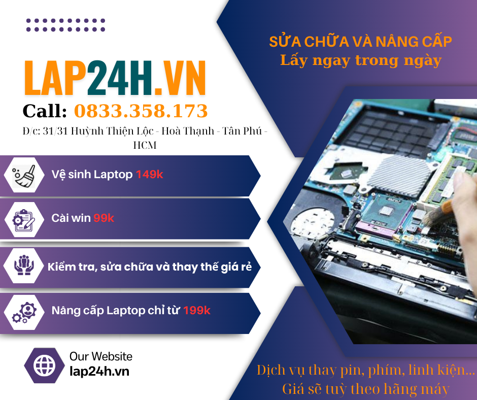 Lap24h chuyên sửa laptop giá rẻ nhanh chóng, chất lượng cao, chi phí hợp lý với tất cả các dòng máy, đảm bảo khắc phục lỗi thành công 100%.