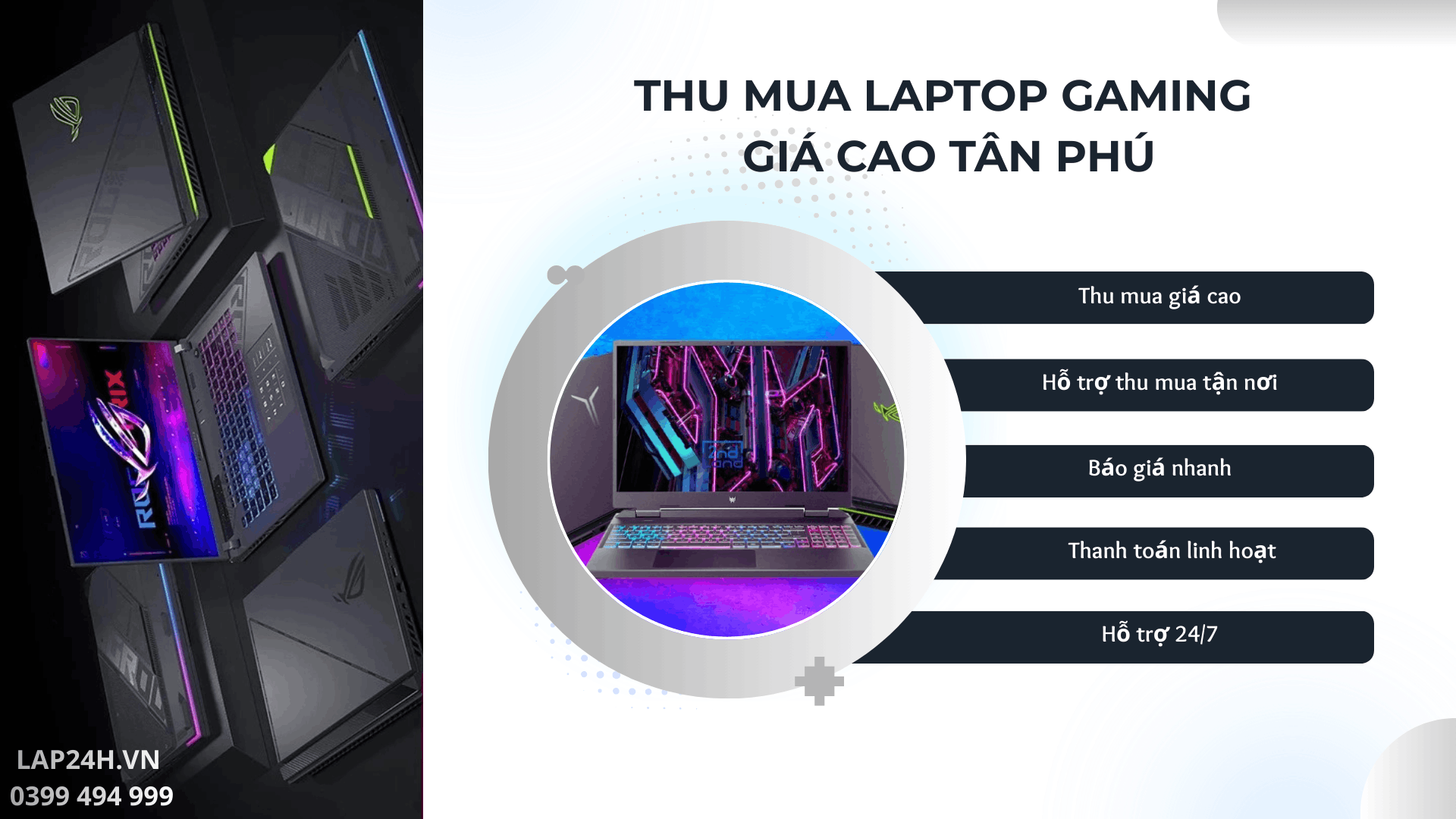 Lap24h là đơn vị thu mua laptop gaming cũ uy tín và thu mua giá cao tại Tân Phú. Hỗ trợ thu mua tận nhà tại Tân Phú và các quận, phường lân cận TPHCM. Nhận thu đa dạng tất cả các dòng laptop Gaming trên thị trường như Asus ROG/TUF, Dell Alienware/G-series, MSI, Acer Nitro 5, Acer Predator, Lenovo Legion, Lenovo Gaming 3, Lenovo LOQ, MSI GF63, ... Nếu bạn có laptop Gaming cần thanh lý, hãy liên hệ với cửa hàng theo Hotline/Zalo 0399 494 999 để được báo giá và thu mua tận nơi nhé!